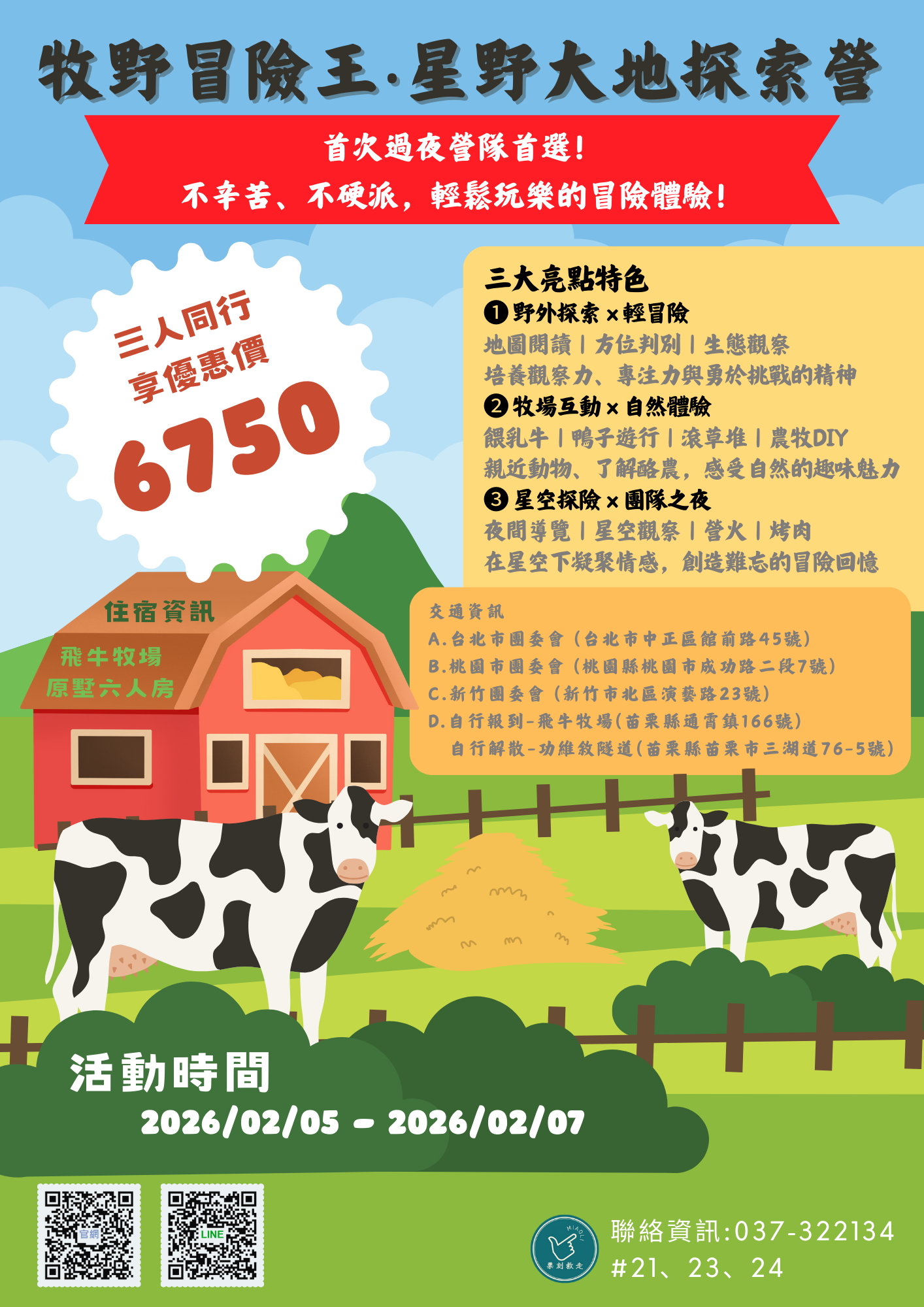 在这片广阔的牧野中,冒险者们将展开一段充满探索与挑战的旅程。从地图与方位辨识、动植物观察到野外求生技能培养,每一步都带领学员亲近自然、锻鍊观察力与团队合作精神。牧场互动活动更是亮点所在,学员可亲手餵牛、参与鸭子游行、滚草堆及手作DIY,深入了解牧场生态与乳牛生活,体验趣味农业魅力。夜幕低垂时,星空下的夜间生态导览与营火晚会,搭配香气四溢的烤肉,为每个冒险日画下难忘的尾声。