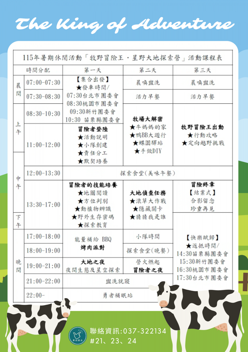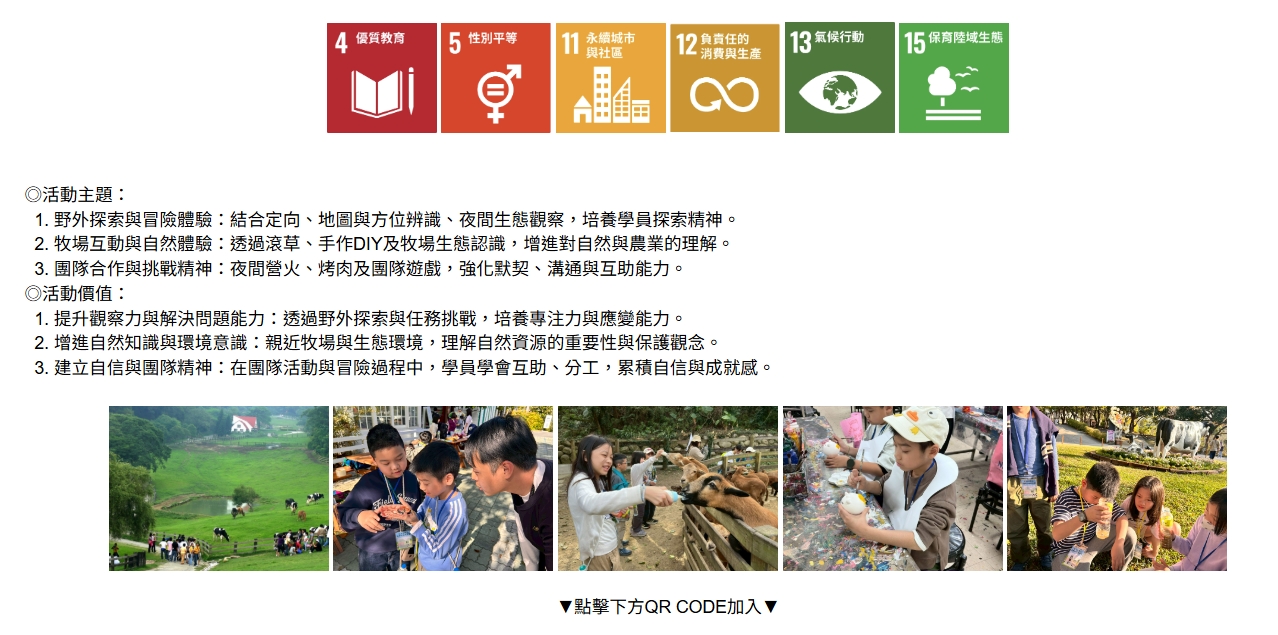 在这片广阔的牧野中,冒险者们将展开一段充满探索与挑战的旅程。从地图与方位辨识、动植物观察到野外求生技能培养,每一步都带领学员亲近自然、锻鍊观察力与团队合作精神。牧场互动活动更是亮点所在,学员可亲手餵牛、参与鸭子游行、滚草堆及手作DIY,深入了解牧场生态与乳牛生活,体验趣味农业魅力。夜幕低垂时,星空下的夜间生态导览与营火晚会,搭配香气四溢的烤肉,为每个冒险日画下难忘的尾声。