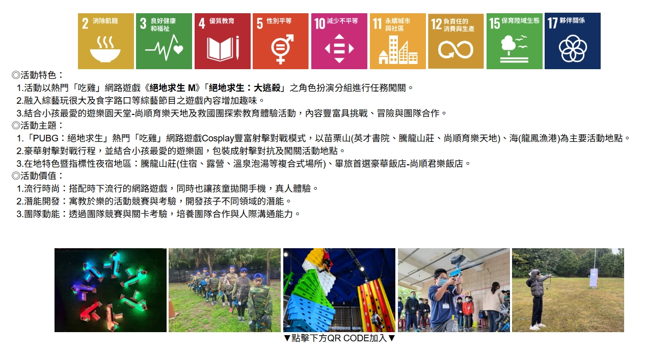 将「PUBG-绝地求生:大逃杀」游戏角色以真人Cosplay方式进行,结合时下最夯综艺节目游戏内容、救国团探索教育体验活动,小孩最爱的游乐园天堂-尚顺育乐天地、实竞射击地图、英才书院、龙凤渔港等特色景点进行不同景点地图的射击对战、团队寻宝、趣味竞赛及闯关活动,活动精彩指数爆表,快快加入大逃杀生存挑战!