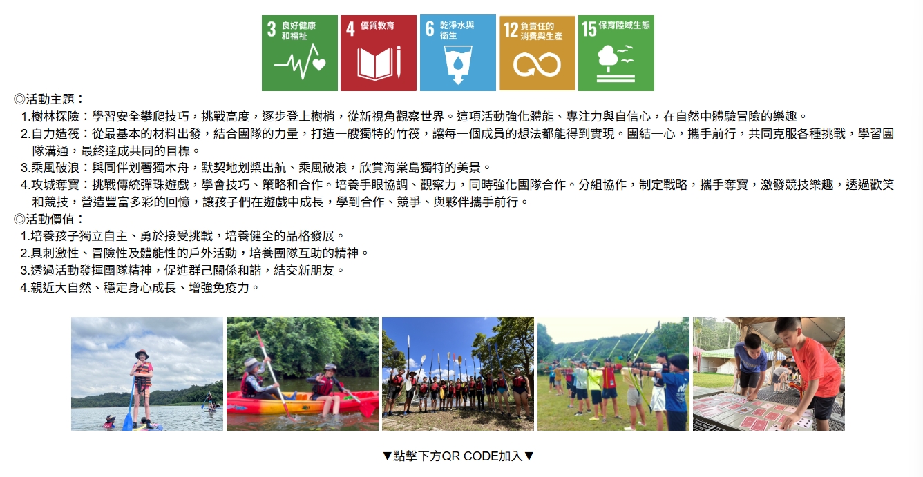 本次营队融合多种户外冒险活动,包括攀树挑战、绳结应用、水上运动等,让参与者突破自我、克服恐惧,提升身心耐力与应变能力。